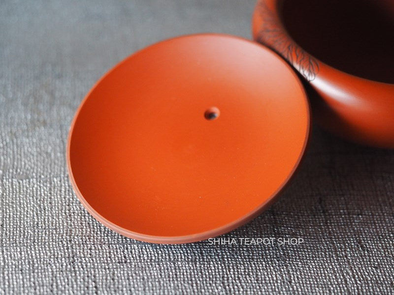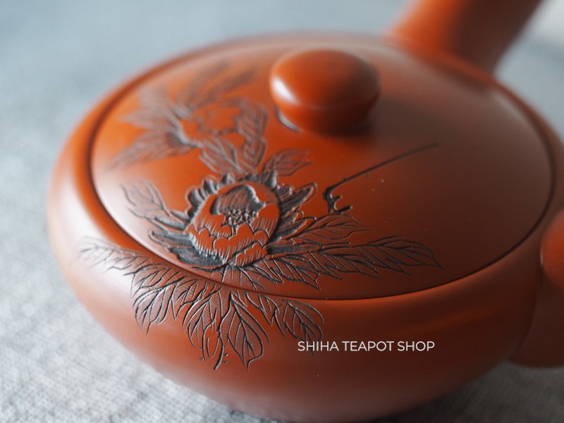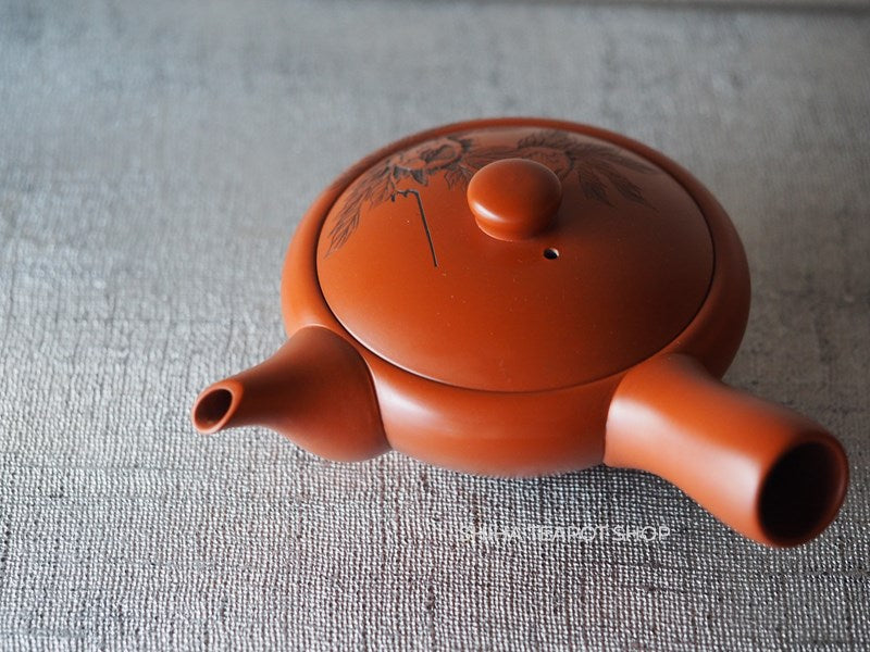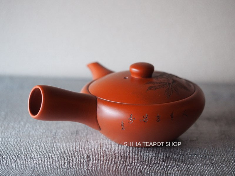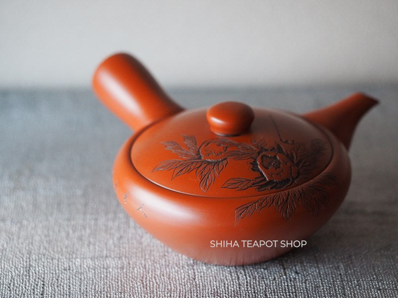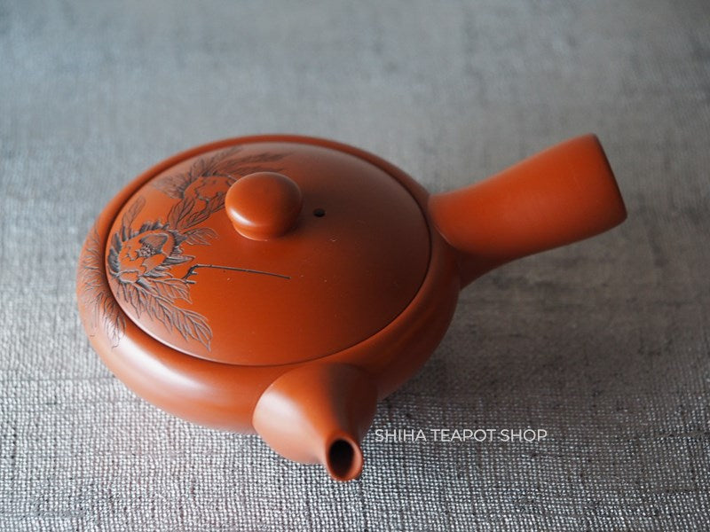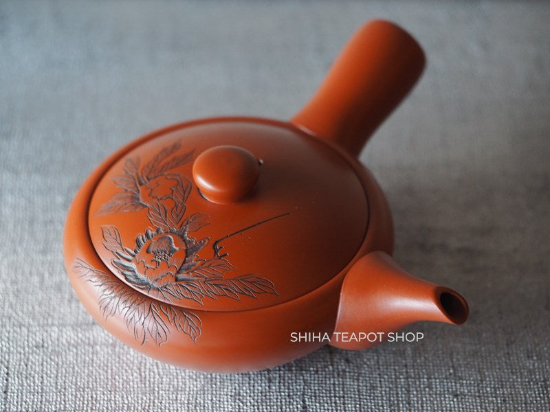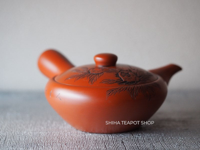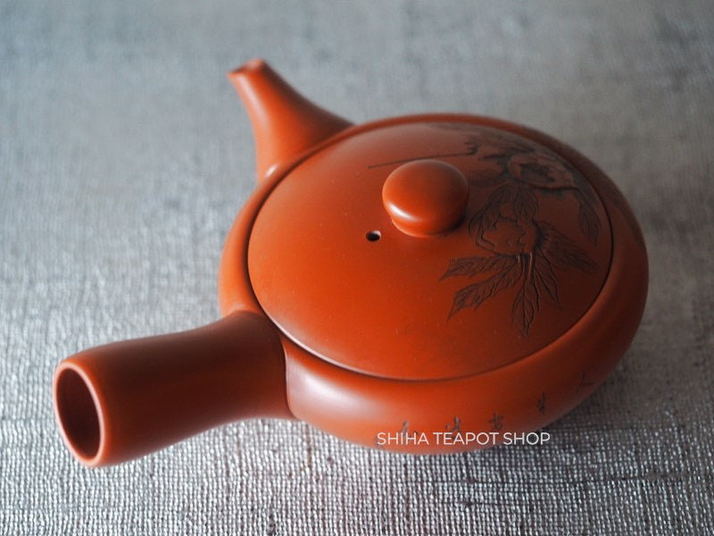 Kozan Vintage Japanese Red Clay Flowe Engraving Kyusu Teapot (Tokoname Japan)