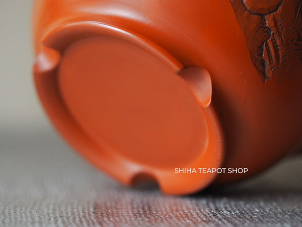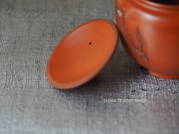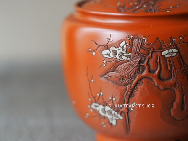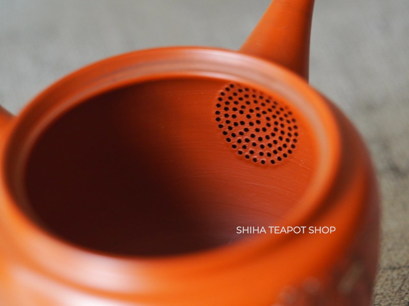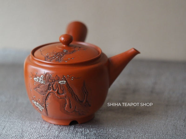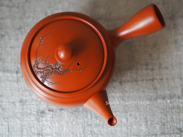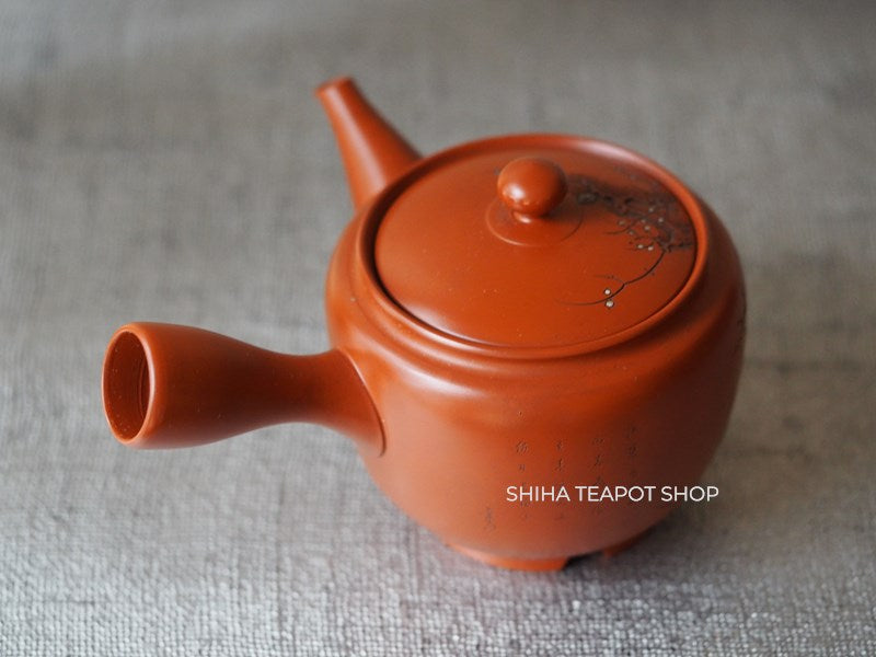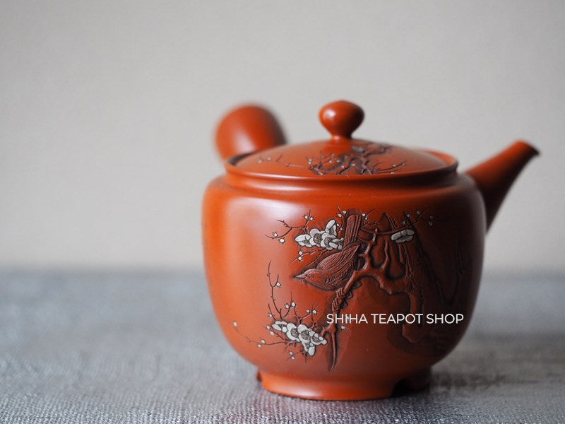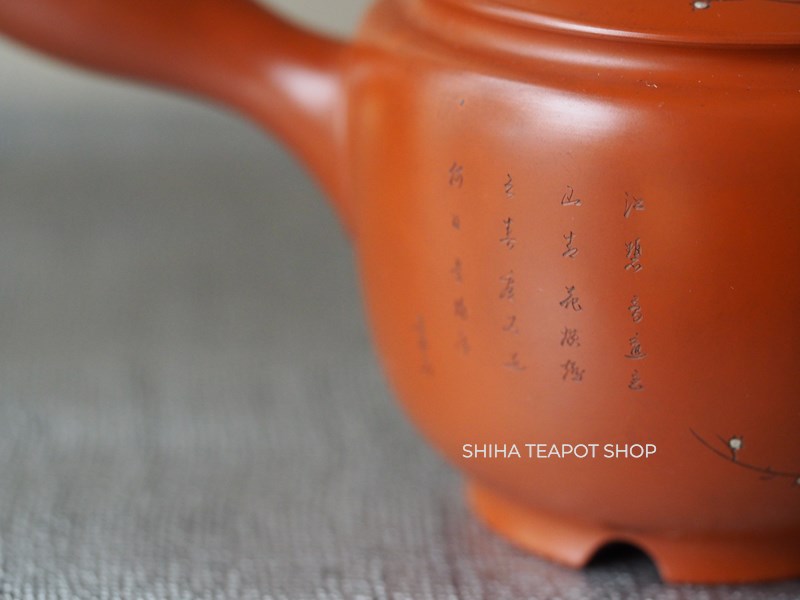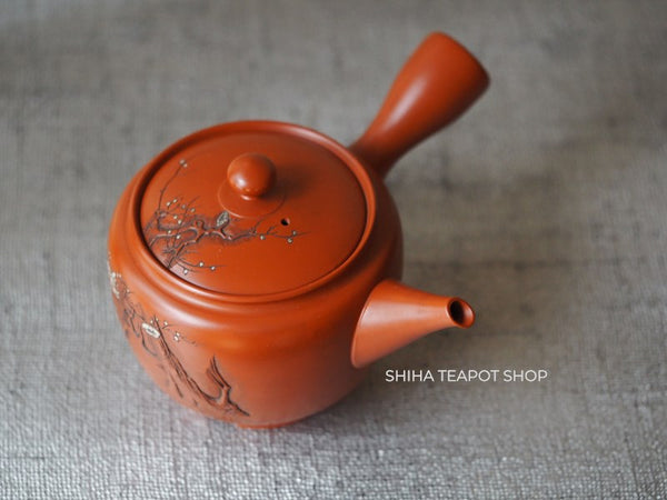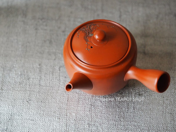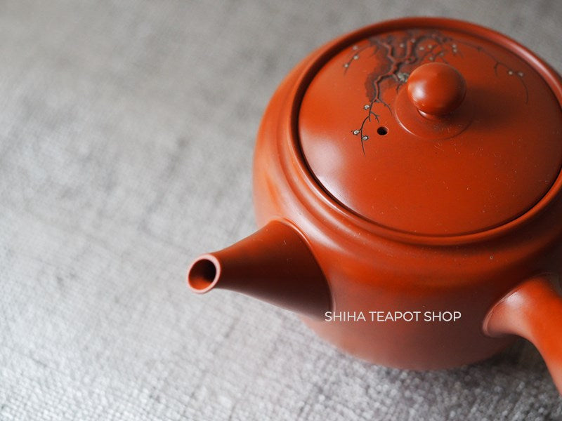 This teapot is delicately crafted with a refined and lightweight structure, showcasing meticulous attention to detail. Its overall balance is elegant, making it not only functional but also a work of art. The lid fits tightly, ensuring a smooth pour. The white plum blossoms stand out beautifully against the red clay. This is a rare collaborative piece by the Yoshikawa father and son. Created 30 to 40 years ago, it remains unused.