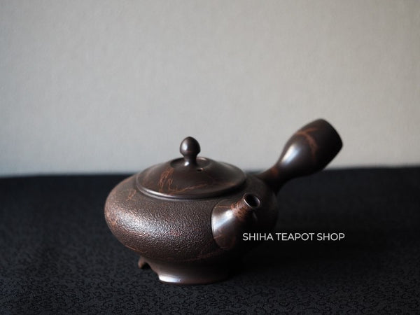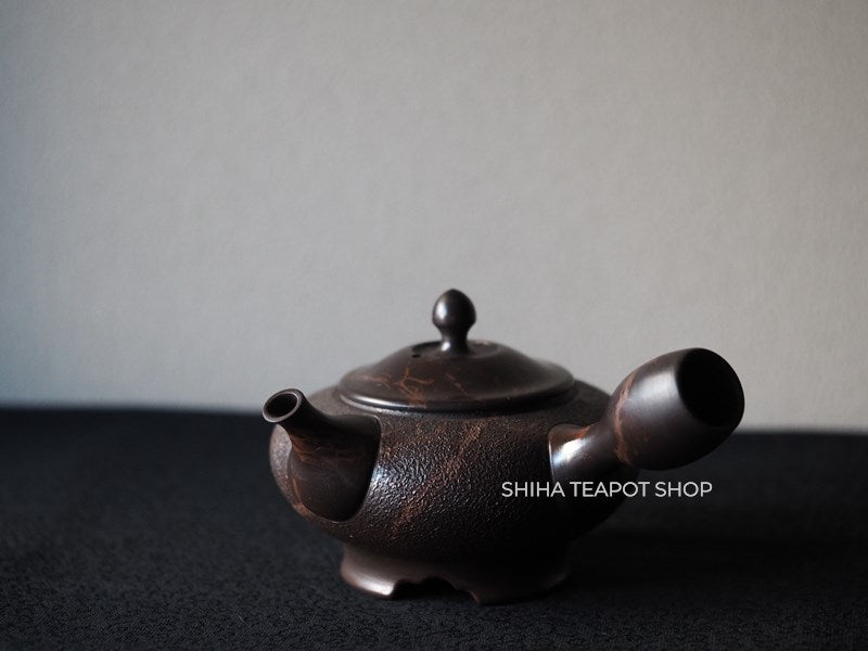 KOSHIN  Black Red Marble Seaweed Flat Tokoname Kyusu Teapot with kodai foot stand