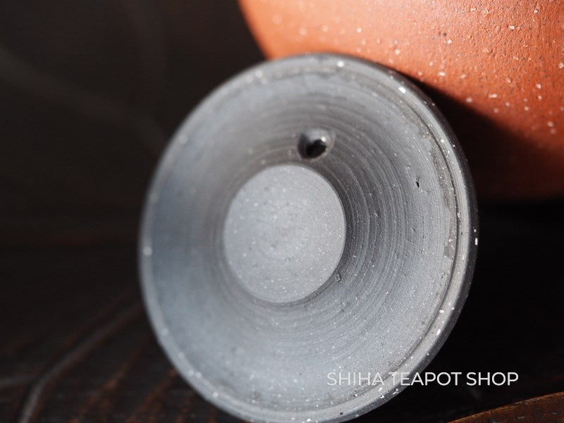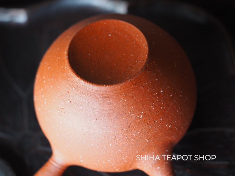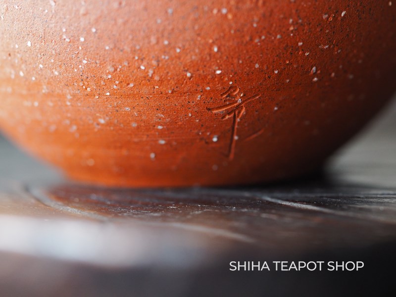 The artist used 2 kind of soil, one is red clay(朱泥), the other is mountain sand (山砂)which is shown like white dot. No glazing.